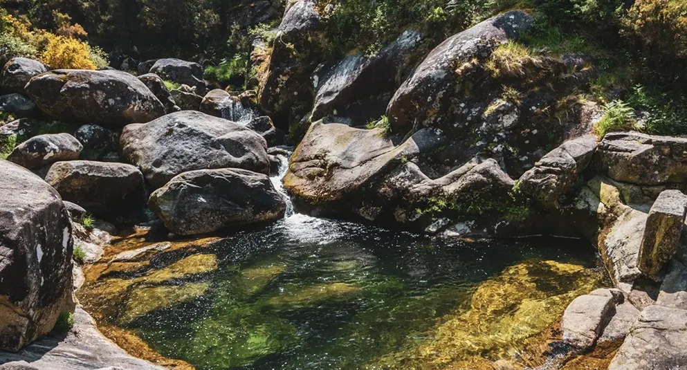Sigue el curso del río Pedras, con sus pozas y cascadas. La ruta culmina en el espectacular mirador de la Curota, ofreciendo vistas de la ría. Es una de las más populares de la comarca.